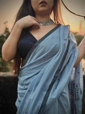 This exquisite grey-colored saree showcases the timeless elegance of handloom cotton. Crafted with meticulous detail, this piece features the beautiful Starbox weave. Made from a blend of 94 count cotton and 92 count cotton, the saree offers a comfortable and breathable feel. The intricate weaving technique results in a lightweight drape that is perfect for any daytime occasion. The subtle greyish hue adds a touch of sophistication, making it a versatile addition to your wardrobe. Experience the beauty and comfort of this traditional Indian garment, perfect for adding a touch of grace to your style. Embrace the charm and comfort this saree offers, making you feel effortlessly beautiful.